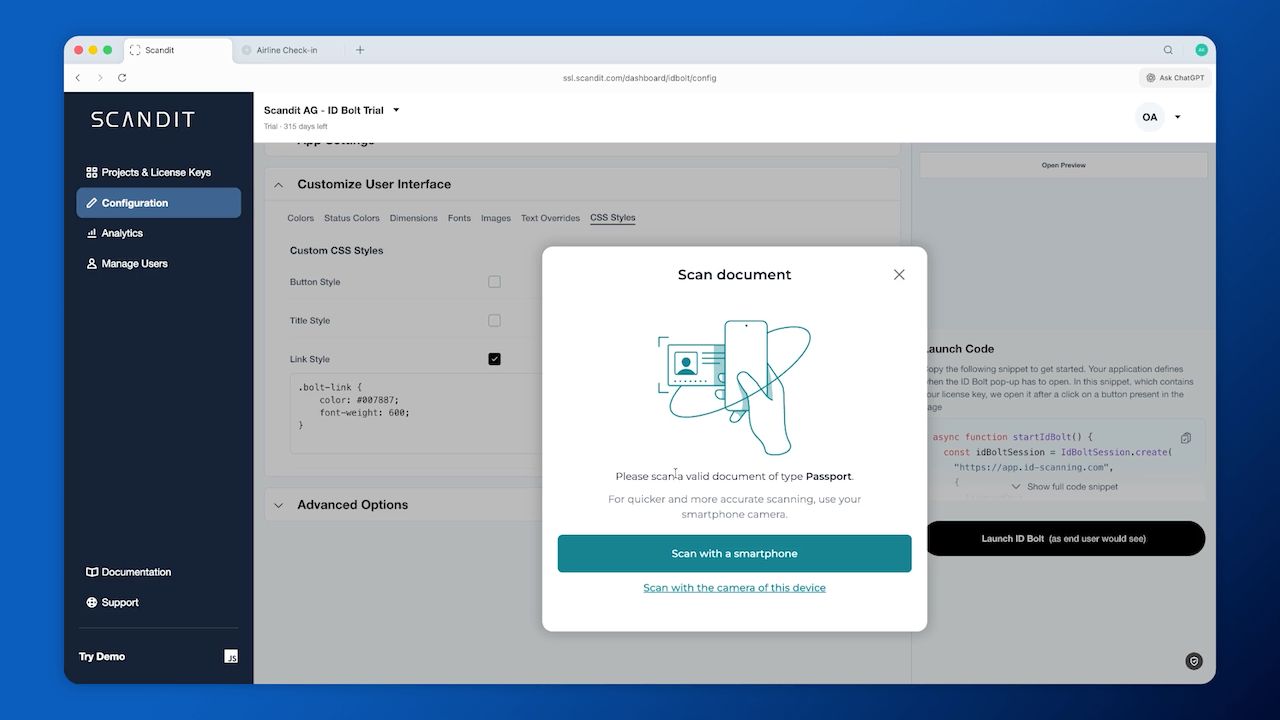 - To try the new configuration in a live ID Bolt session, complete with a modal dialog to scan a real ID, I can click Launch ID Bolt. If you select Scan by phone, your phone experience will also match the customizations defined above.