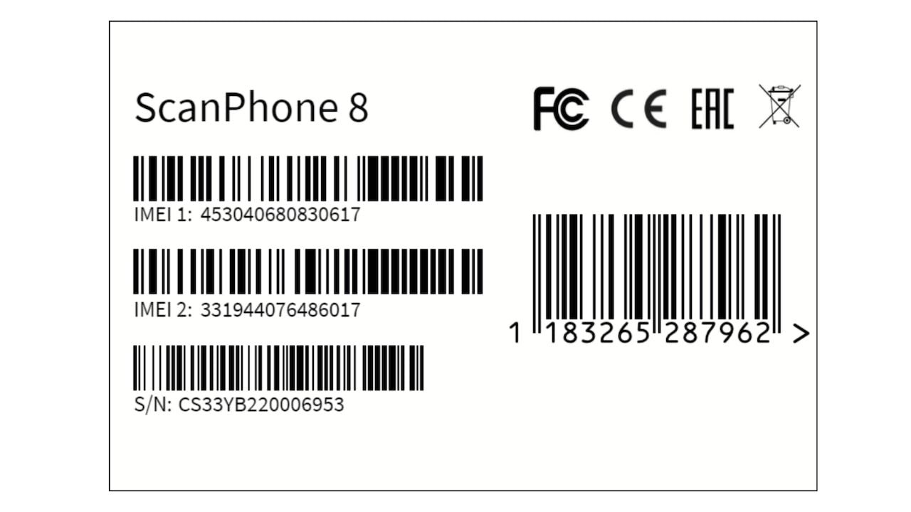 この電子機器ラベルをスキャンしてみてください。IMEI 1、IMEI 2、シリアル番号、UPC が含まれています。