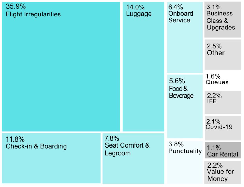 The chart below, by TMNT, compares poor Tripadvisor reviews between 2020 and 2023. It gives some indication of where the challenges lie for airlines.