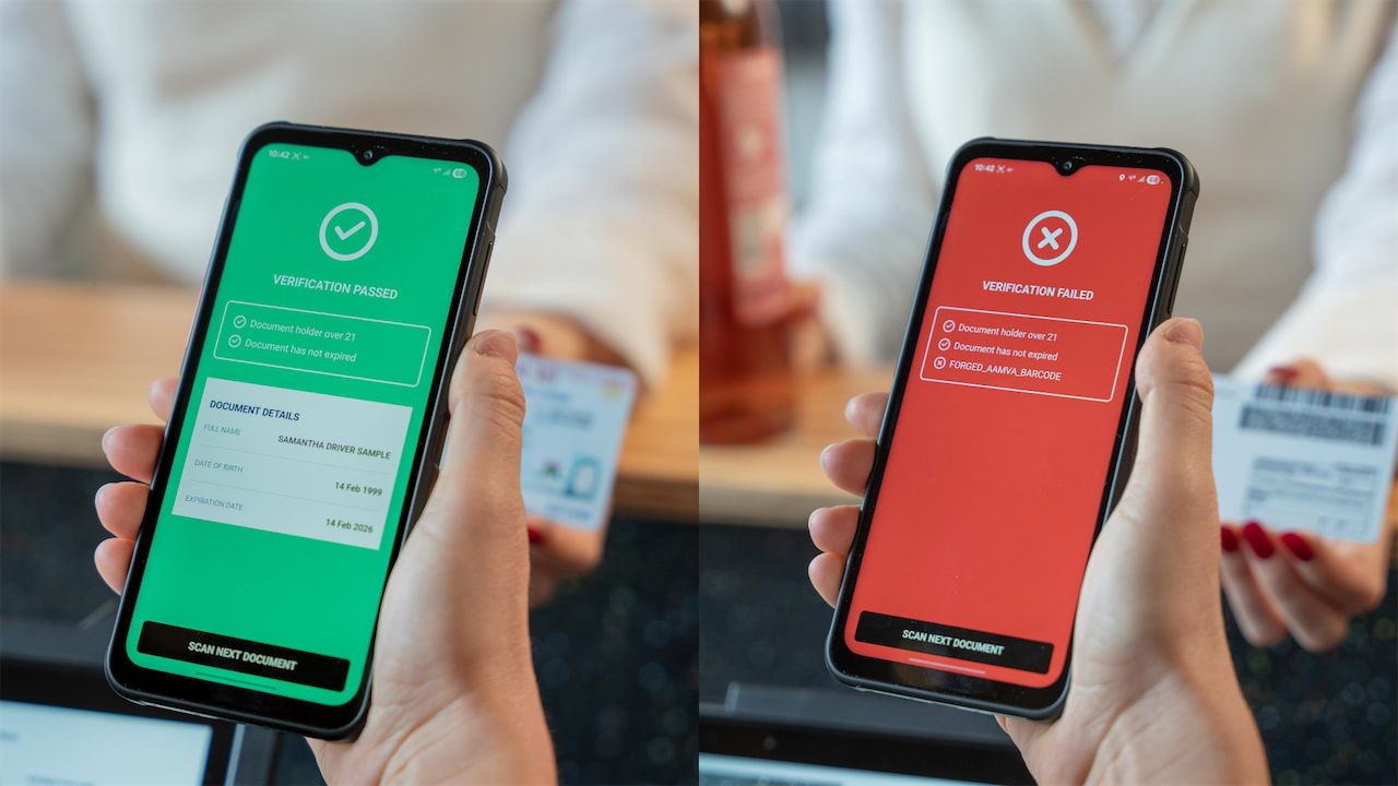 If the ID is valid, a green VERIFICATION PASSED screen appears with the document’s details. If the ID isn’t valid, a red VERIFICATION FAILED screen appears with the reason for failure—for example, if the document is expired or if a fake is detected.