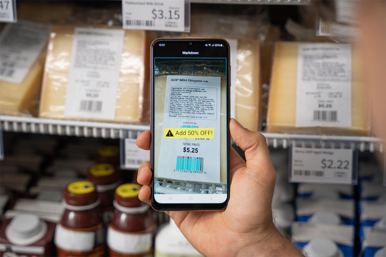 Users simply hover the camera over an item’s barcode and expiry date. Scandit Express captures and interprets the data based on the configured logic. An AR overlay is then displayed, guiding the user on the appropriate action to take.